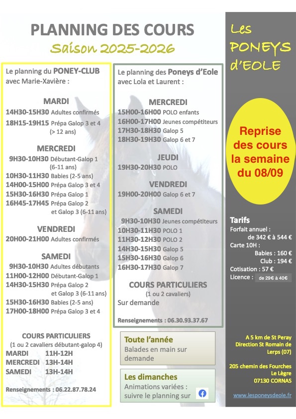 Les Inscriptions pour les cours d'équitation sont ouvertes, possibilité de faire 1 à 3 essais sur RDV au tarif de 24€/seances. : Programme et tarifs