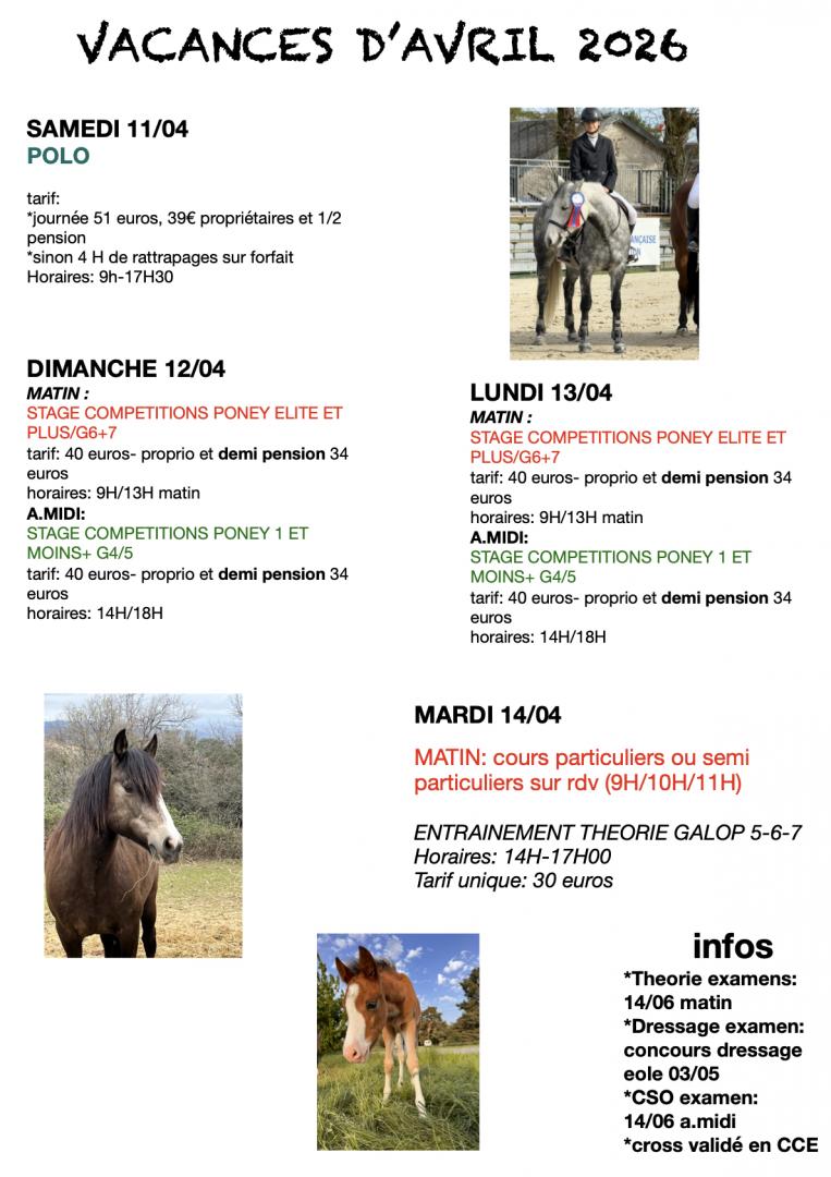 Stage : Vacances d'Avril 2026 mise a jour le 28 Mars